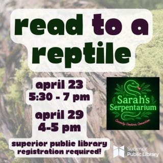 Join us April 23 from 5:30-7 p.m. or April 29 from 4-5 p.m. for Read to a Reptile with Sarah Glesner of Sarah’s Serpentarium! Every month, Sarah brings a special reptile guest from her serpentarium and children have the opportunity to sign up for a …