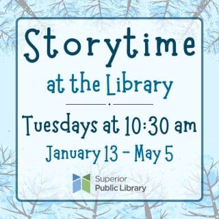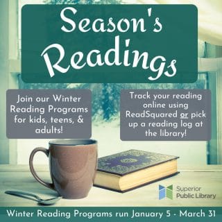 Superior Public Library offers winter reading programs for all ages! Pick up a bingo card (kids & teens) or reading log (adults) at the library or track your progress online using ReadSquared for a chance to win a $50 Foxes & Fireflies gift card!
