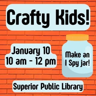 Crafty Kids | January 10Posted on January 5, 2026 Join us January 10 from 10 a.m. – 12 p.m. for Crafty Kids and get crafty at the library! We’ll supply everything your child will need to create their very own I Spy jar/bottle!No registration required!