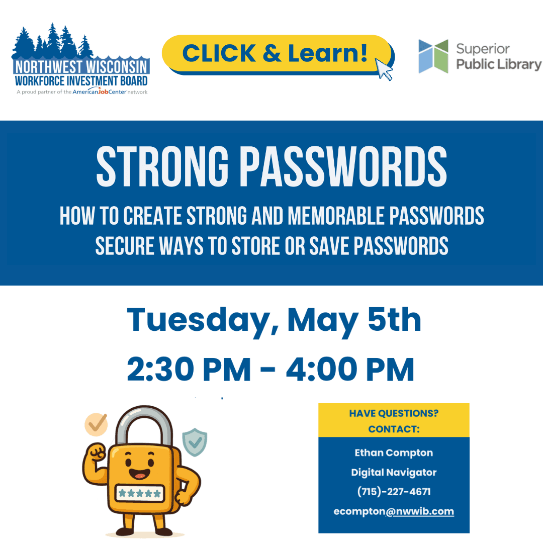 Come to the library and learn how to use technology to improve your life! On May 5 at 2:30 p.m., join CLICK & Learn Digital Navigator Ethan Compton for a FREE class about how to create and store strong passwords and how to use two-factor authentication to keep your accounts secure. No registration required!