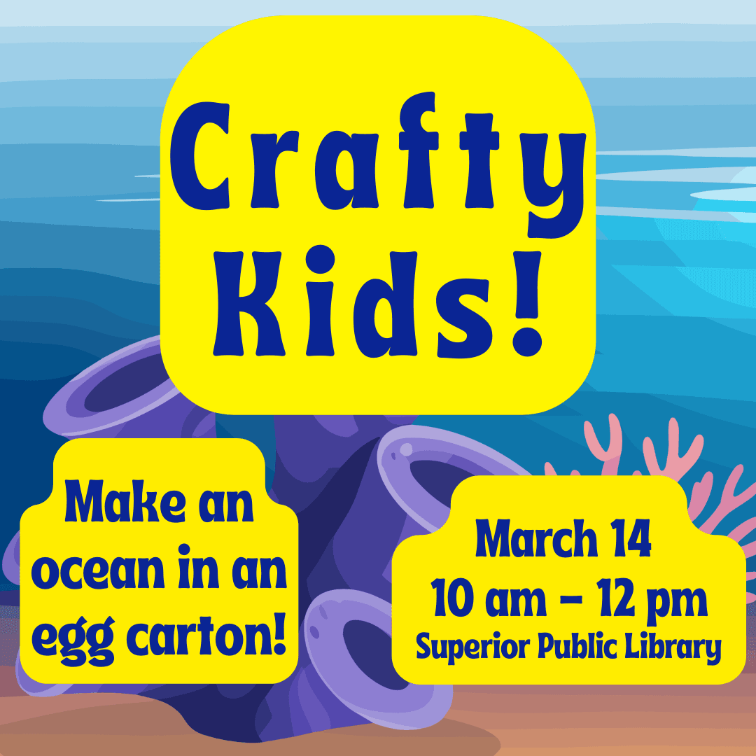 Our next Crafty Kids program will be held Saturday, March 14 from 10 a.m. to noon, and we’ll make an ocean in an egg carton in honor of the new Pout Pout Fish movie! No registration required and all supplies provided! Stop by the library and make a craft!