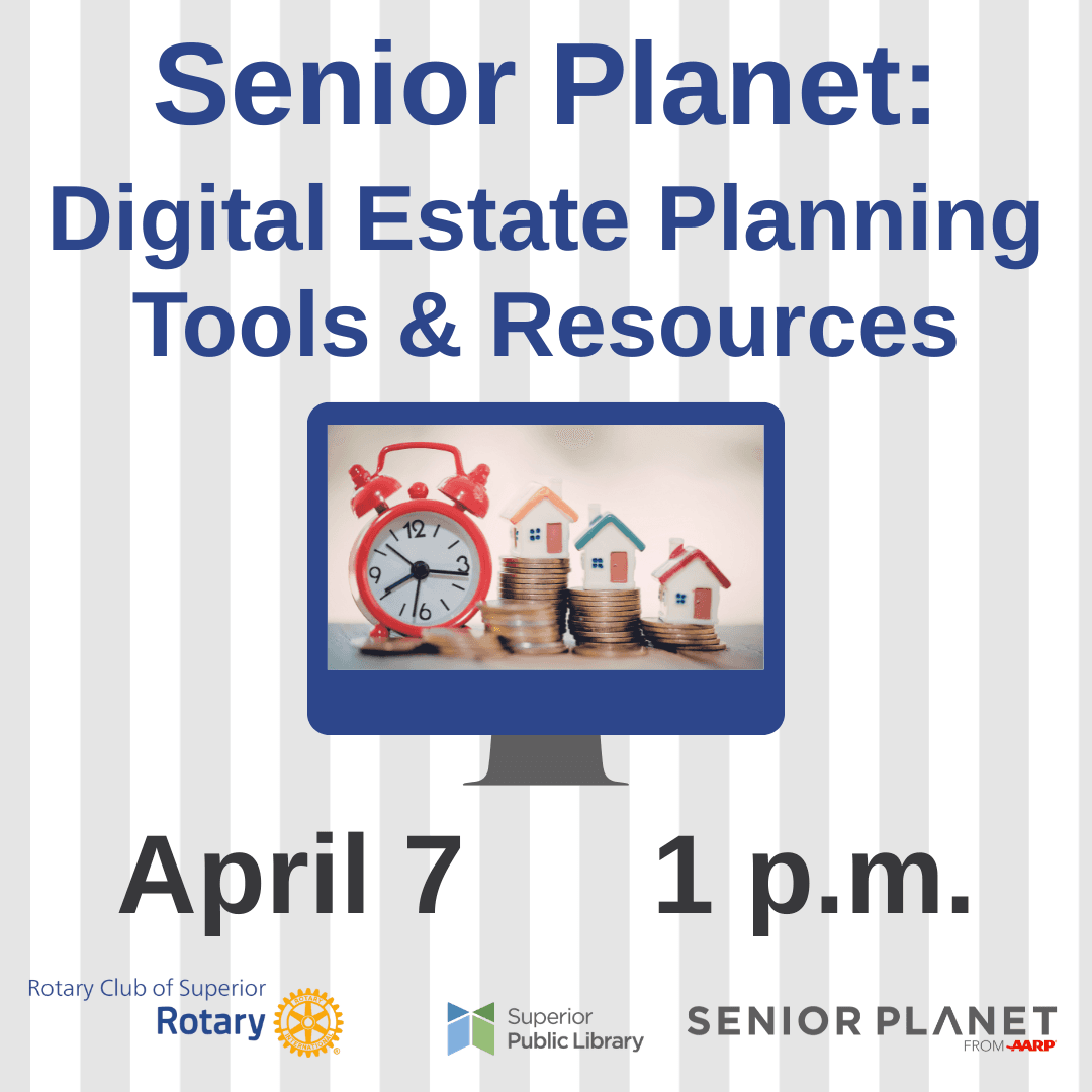 FeaturedSuperior Public Library 1530 Tower Ave., Superior, WI, United StatesA simple plan is better than no plan! Estate planning may sound intimidating, but it's how you can make sure that your health, finances, and anything you own is handled according to your wishes. Join Jen and Leslie at the library on April 7 at 1 p.m. for a FREE Senior Planet program, "Digital Estate…