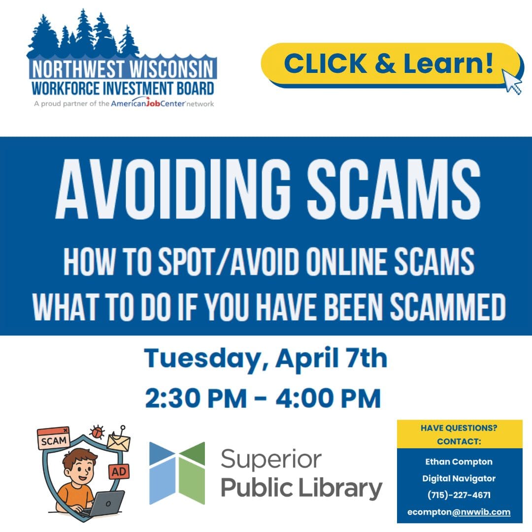 FeaturedSuperior Public Library 1530 Tower Ave., Superior, WI, United StatesLearn how to protect yourself from online scams at a FREE presentation with Digital Navigator Ethan Compton from the CLICK & Learn program on Tuesday, April 7 at 2:30 p.m. He’ll provide tips for avoiding scams and will also tell you what to do if you think you’ve been scammed. No registration required.