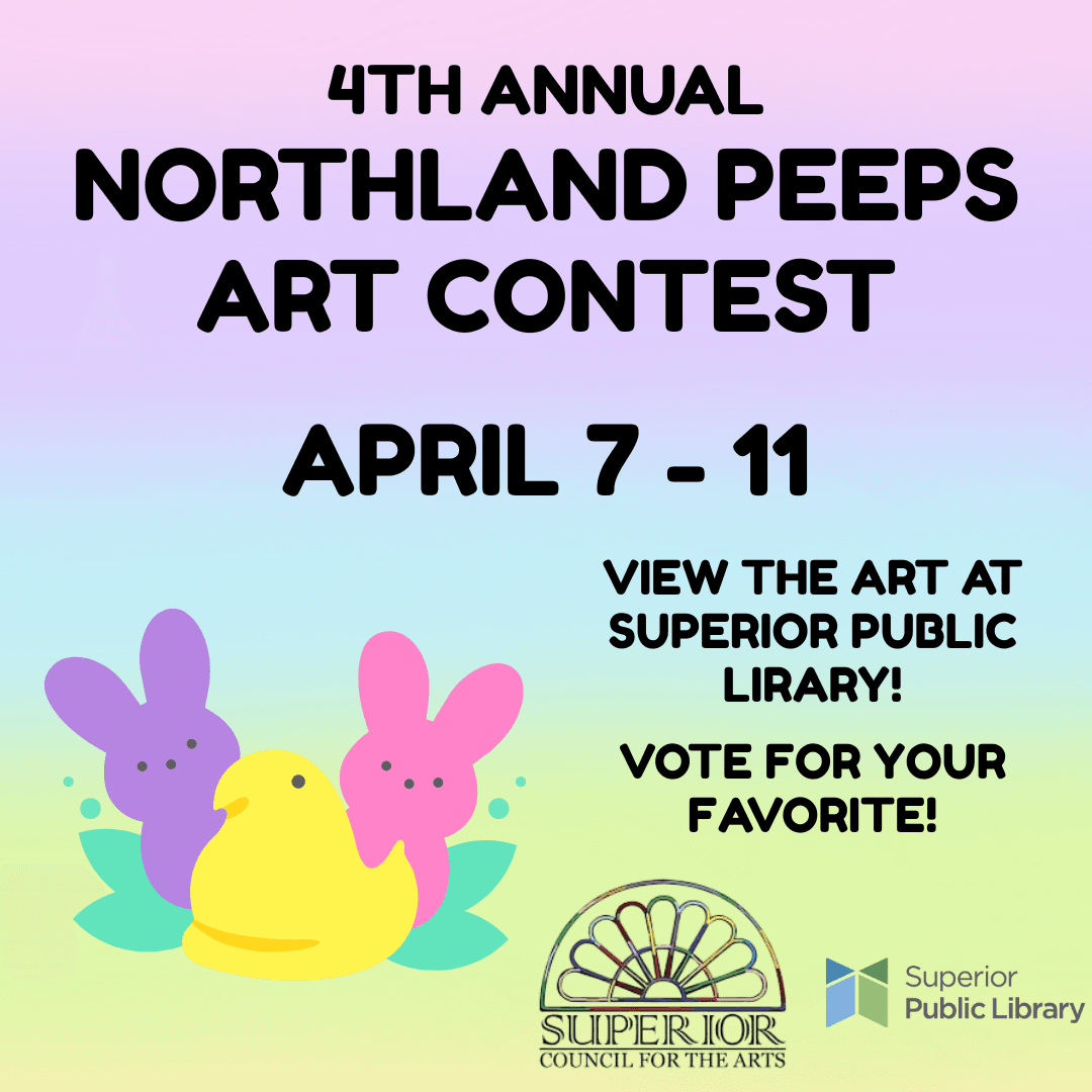 FeaturedSuperior Public Library 1530 Tower Ave., Superior, WI, United StatesCome experience one of the most creative (and sweetest!) events of the Spring! The Superior Council for the Arts invites our community to attend the 4th Annual Northland Peeps Art Contest Exhibit, on display April 7 –11, 2026 at the Superior Public Library. Local artists of all ages have transformed colorful marshmallow Peeps into imaginative…