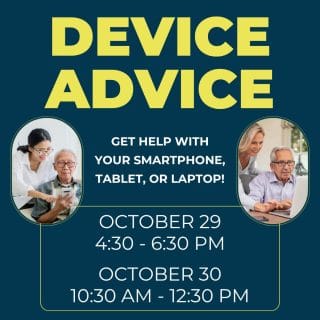 ![]() ![]() Do you have a question about your smartphone, tablet, or laptop? Bring it to Device Advice, a monthly drop-in program where you can get one-on-one help with common device issues like using email, downloading apps, adjusting your settings, and more. Our patient and persistent library staff will do their best to help you use your… ![]()