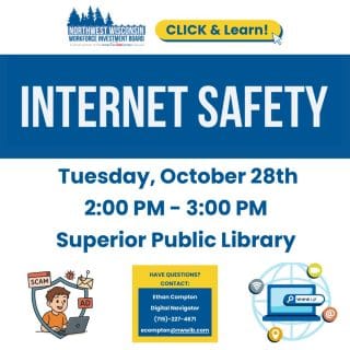 Join NWWIB Digital Navigator Ethan Compton at the library on October 28 at 2 p.m. for a hands-on Internet Safety class designed to help you stay secure online! Learn how to spot scams in emails, texts, and phone calls, understand common types of malware, and discover simple steps to protect your devices. You’ll also practice… |