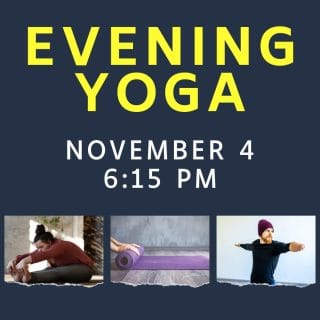 ** CANCELED ** Join us Tuesday, November 4 at 6:15 p.m. for a free Evening Yoga class led by instructor Jen Rosnau. Bring a yoga mat and follow a series of poses that will help you build strength, improve flexibility, and boost your mood. This class is open to ages 12 and up. No registration… |