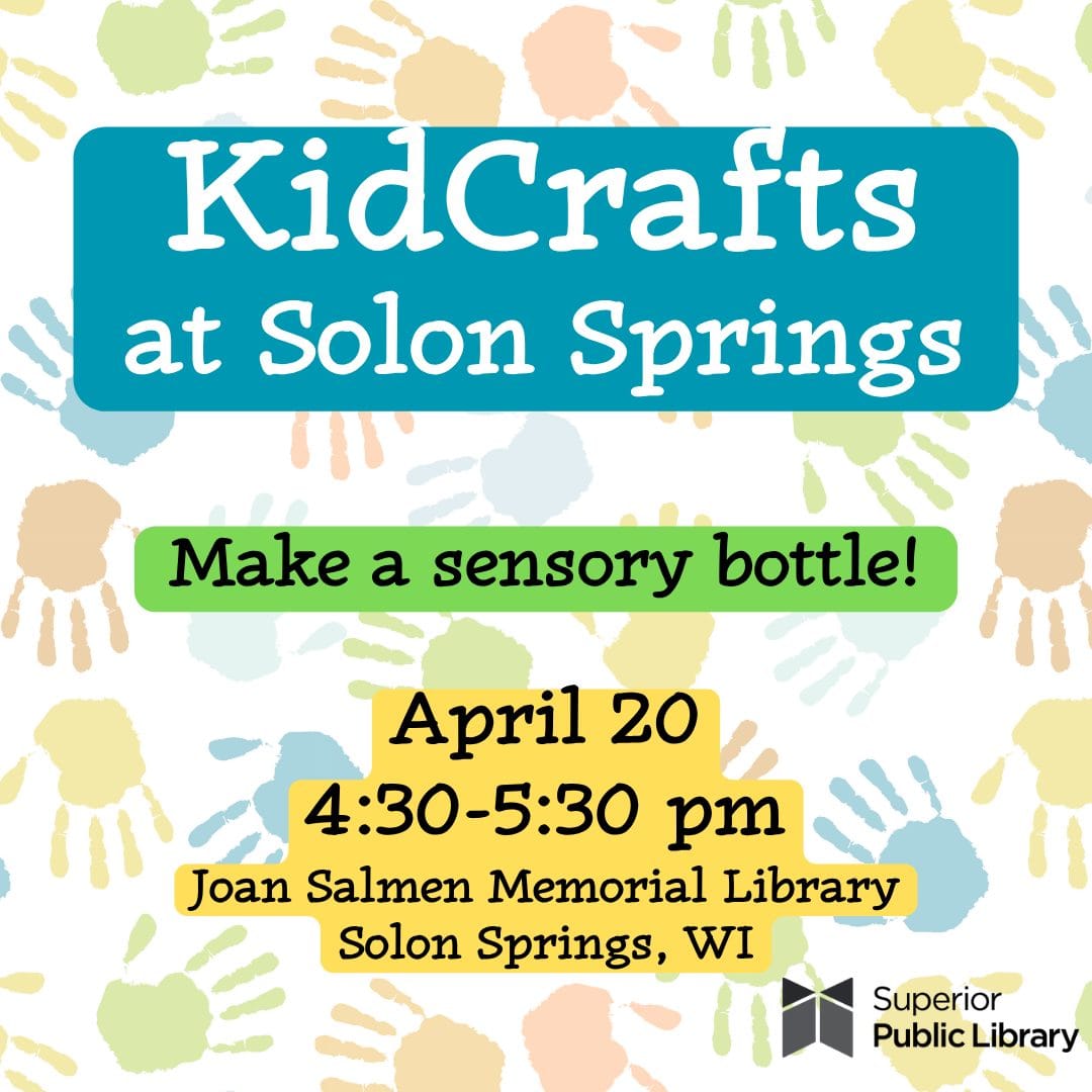 FeaturedJoan Salmen Memorial Library 9420 E. Main, (Old Village Hall), Solon Springs, WI, United StatesCome to the Joan Salmen Memorial Library in Solon Springs for KidCrafts on Monday, April 20 from 4:30-5:30 p.m. and make a sensory bottle craft! All supplies provided and NO registration required.